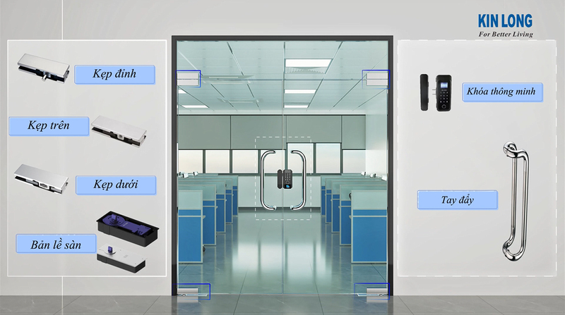 🔹 Phụ kiện cửa kính: bản lề sàn, khóa thông minh, tay đẩy,…